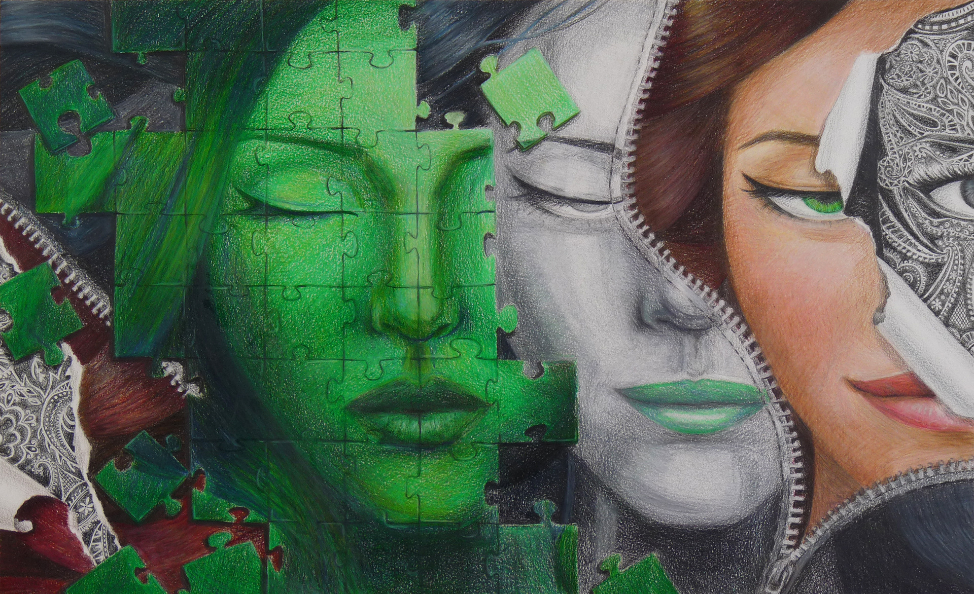 I was inspired after reading a book, Identical, by Ellen Hopkins which is about a girl who suffers from a Dissociative Identity Disorder. Because of this disorder, she believed that she was two completely separate identities. And through the distinct characteristics of each of the faces in my artwork, I wanted to depict the many different layers in a person’s personality. Some people behave differently around certain people. It takes awhile for the person to truly reveal who they are deeply inside.